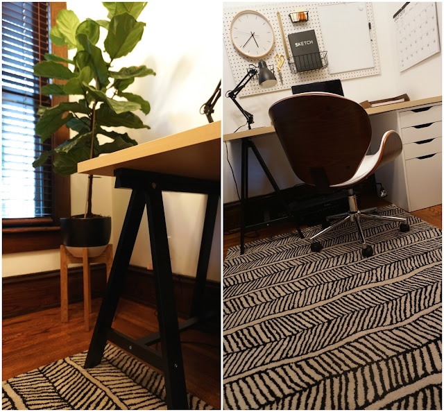 Source List: Desk pieces parts from IKEA, Desk Chair, Light Fixture, Rug, Plant Stand, Green Velvet Pillow, Black Buffalo Check Pillow